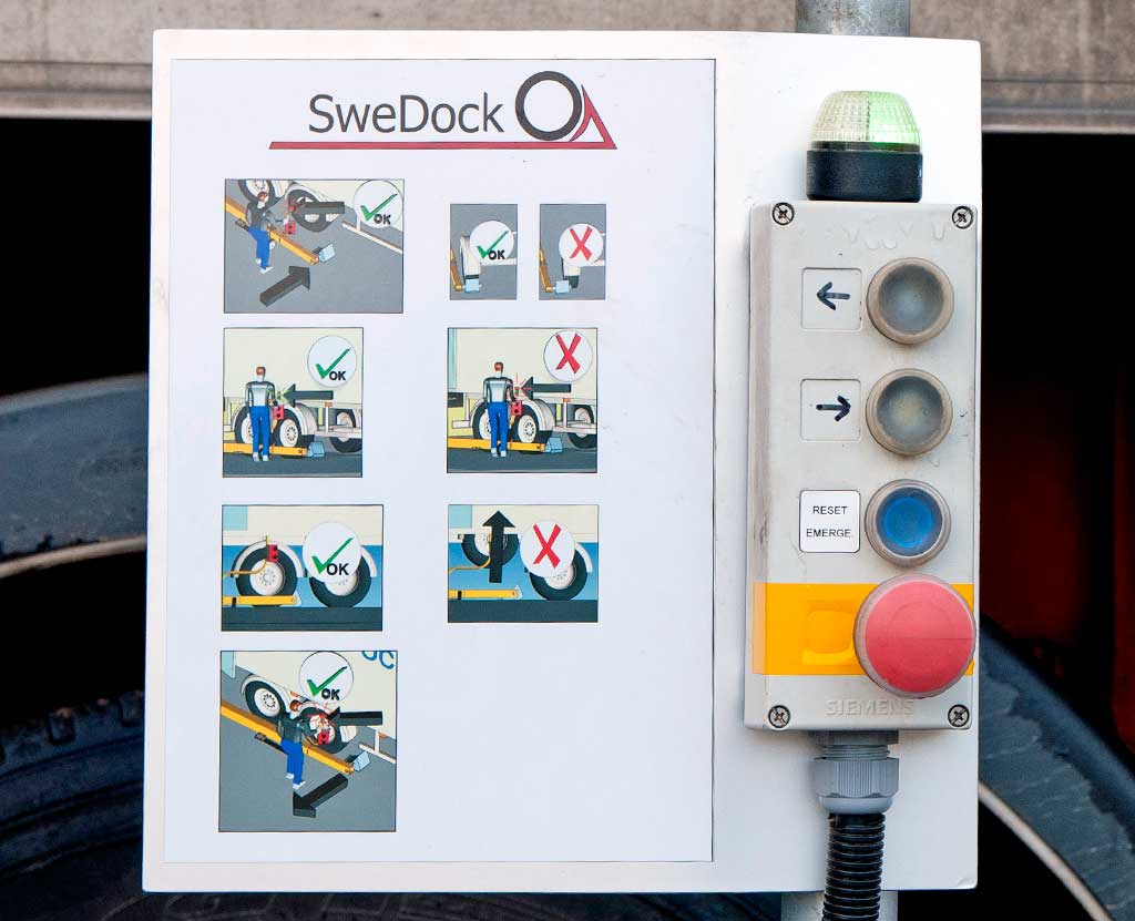 Manöverpanel med reglage, ljussignaler och instruktion. Operatören har full uppsikt över händelseförloppet från platsen. Ljussignalen övergår från röd till grön som bekräftelse att tillräcklig åtdragningskraft erhållits och att lastsäkringsarmen är i position.